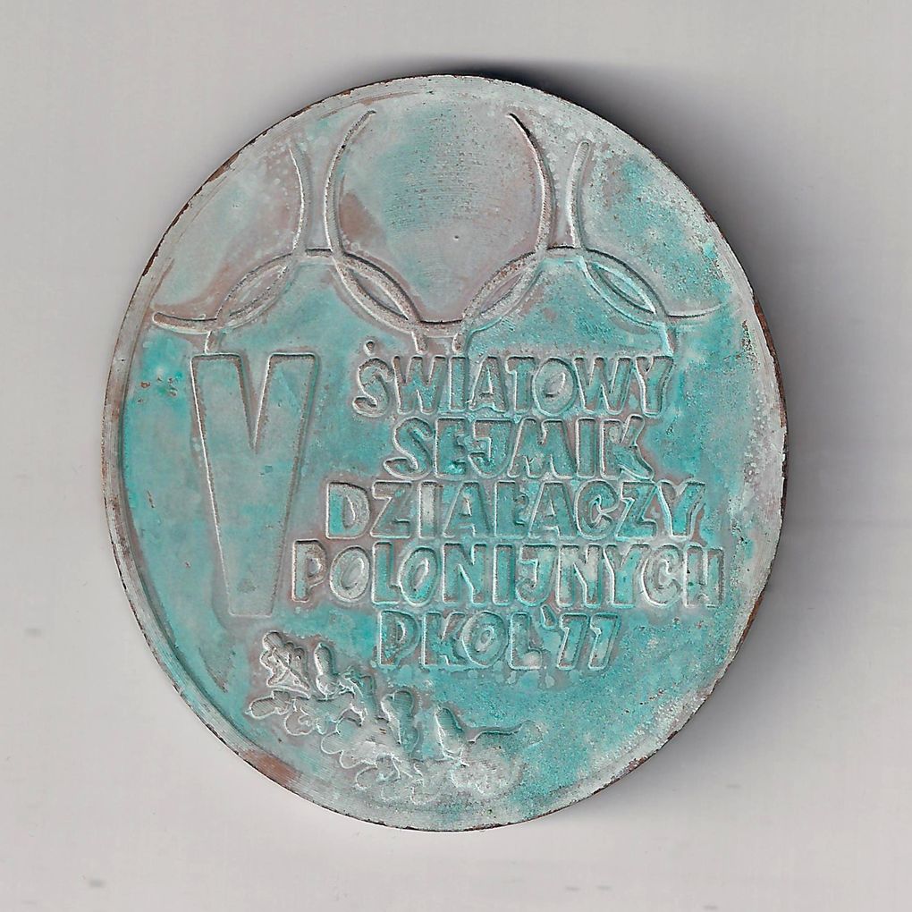 Awers: U góry kółka olimpijskie, w środku z lewej duża piątka rzymska a obok napis: "V ŚWIATOWY/SEJMIK/DZIAŁACZY/ POLONIJNYCH/ PKOL'77". U dołu mała gałązka dębu.