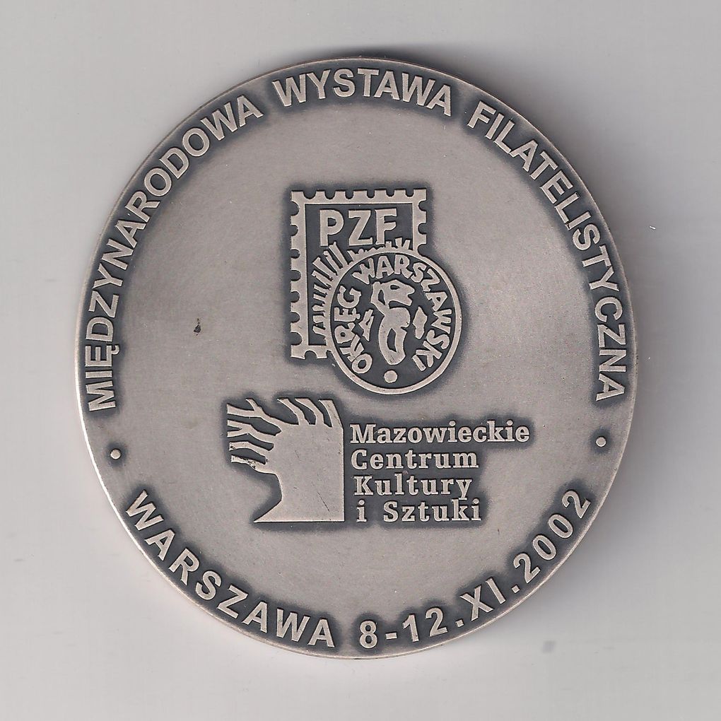 Awers: Na tle znaczka pocztowego z literami PZF logo, poniżej stylizowane drzewo i napis: MAZOWIECKIE CENTRUM KULTURY I SZTUKI. W otoku napis: MIĘDZYNARODOWA WYSTAWA FILATELISTYCZNA * WARSZAWA 8 12. XI.2002.