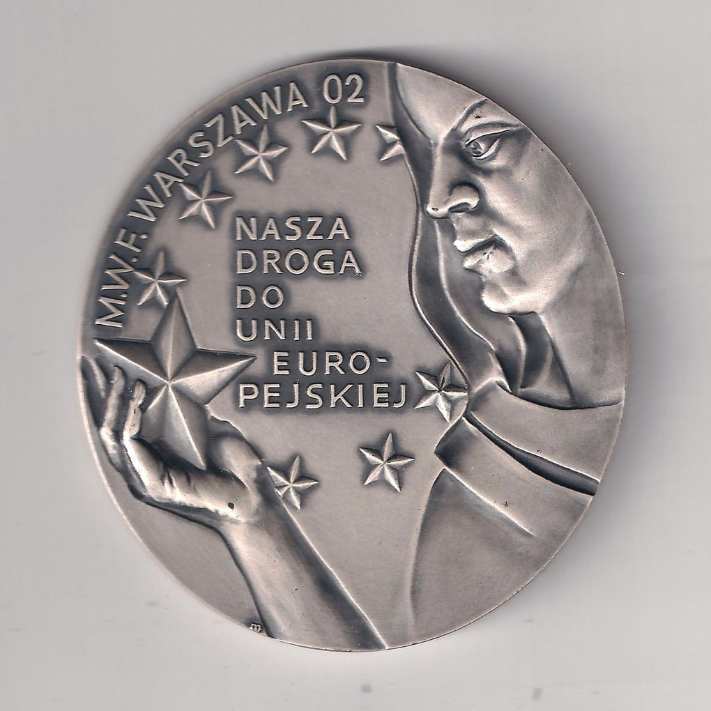 Rewers: Fragment postaci w lewo trzymającej w dłoni gwiazdę oraz napis: NASZA / DROGA / DO / UNII / EURO- / PEJSKIEJ otoczony gwiazdami. Wzdłuż lewej krawędzi półkolisty napis: M.W.F. Warszawa 02.
