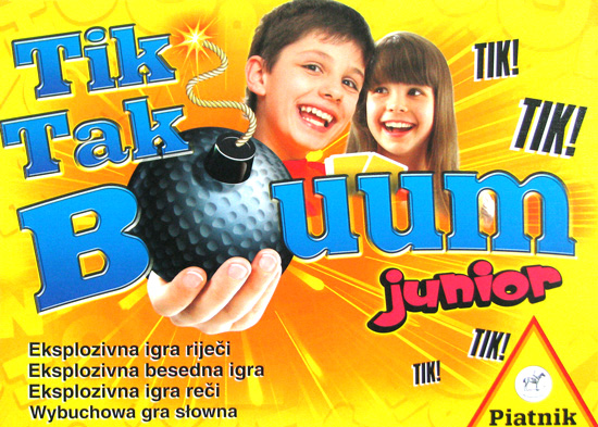 Tik Tak buum junior : Wybuchowa gra słowna - Piatnik, - 55 kart z zabawnymi obrazkami, 1 elektroniczna bomba z mechanizmem czasowym, 1 isntrukcja. Gra odpowiednia dla dzieci powyżej 5 lat, przeznaczona dla 2-12 graczy.