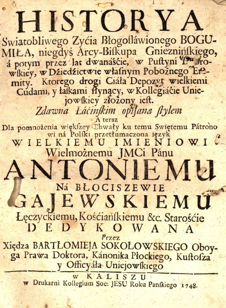 Zawiera Bartłomieja Sokołowskiego: Addytament Rożnych Cudow poprzysiężonych, ktorych Ludzie doznali zá wezwániem Intercessyi Bogumiła S...