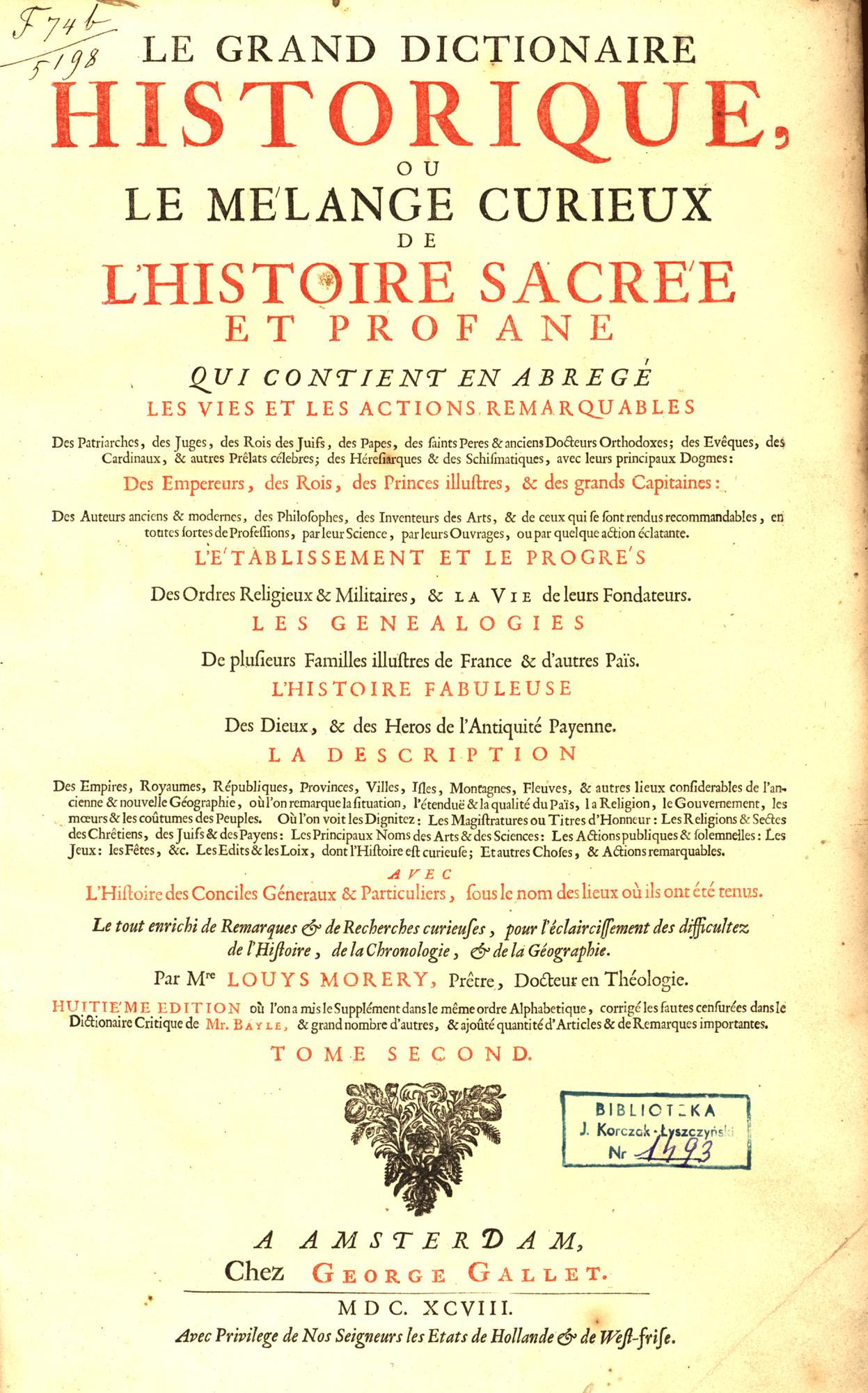 K. przedtyt.: Le grand dictionaire historique. Neuviéme edition [...]. Tome second. C-F.