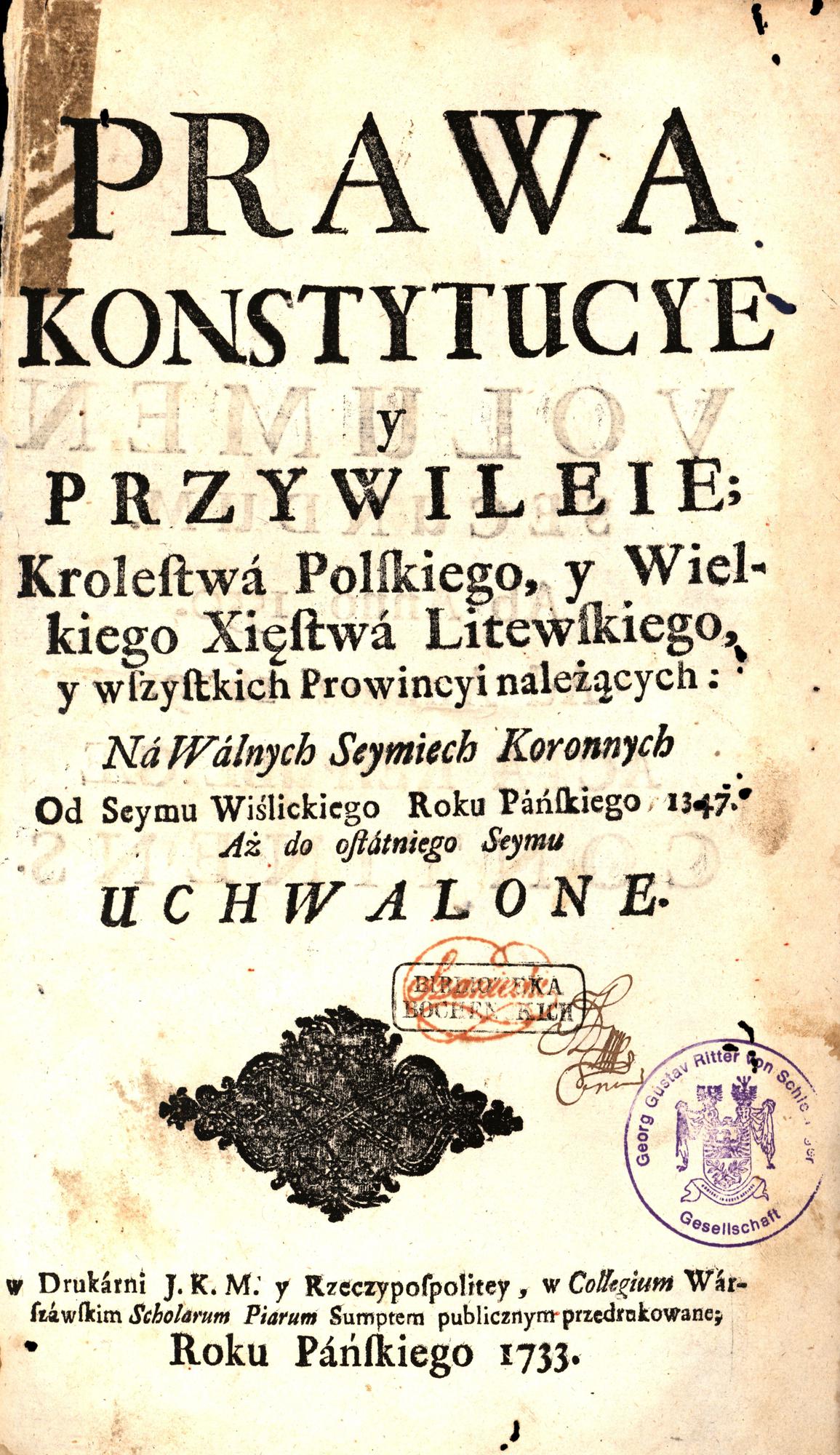 Prawa, konstytucye y przywileie Królestwa Polskiego, Wielkiego Xięstwa Litewskiego y wszystkich prowincyi należących na walnych seymiech koronnych od Seymu Wiślickiego roku pańskiego 1347 aż do ostatniego Seymu uchwalone