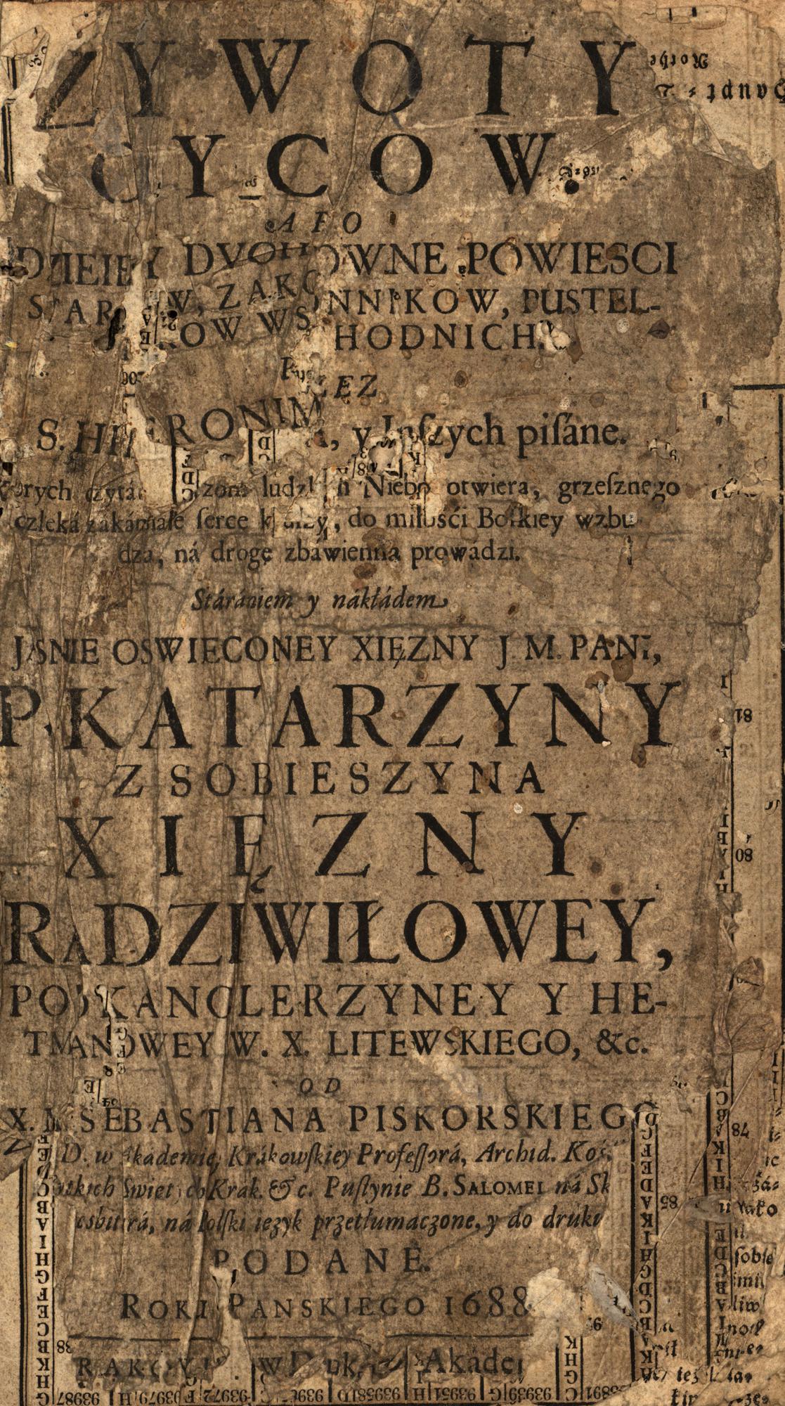Cz. 1, ks. 1: Zywoty męzow Swiętych [...] / Od S. Hieronyma y inszych napisana ; Cz.1, ks. 2: Zywot Swiętych Barlaama Pustelnika Y Iozafata Krola Indyiskiego / Od s. Iana Damascena pisany, Od Iakoba Billiusa Prunego tłumaczony ; Cz. 2, ks. 4: [Zywotow Ss. Pustelnikow] / od Rvfina Akwileiey Kapłana abo napisana, abo z Greckiego wytłumaczona ; Cz. 3, ks. 1: Historia Lausiaka nazwana / od Palladiusza [...] napisana od Gentiana Herveta przetłumaczona.