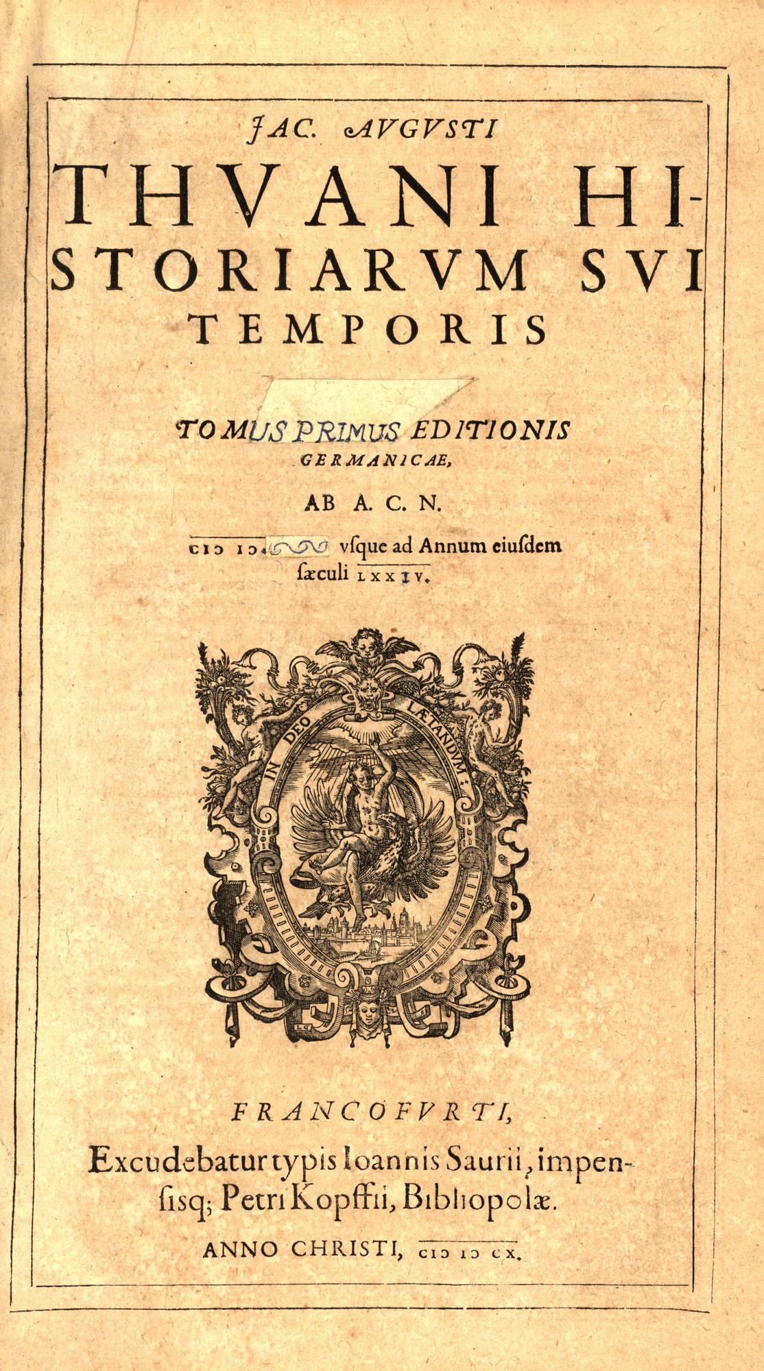 Jac. Augusti Thuani Historiarum Sui Temporis Tomus Secundus Editionis Germanicae : Ab A.C.N. 1574. [rzym] usque ad Annum eiusdem saeculi LXXX. inclusiue. - Cum dilutione falsae inscriptionis, quam editio Parisiensis in ipso titulo & limine nequicquam intentauit. - Francofurti : Excudebatur typis Ioannis Saurii, impensisq[ue] Petri Kopffii, 1610. - [12], 1164, [64] ; [4], 242, [29], 210, [19] ; 35 cm.