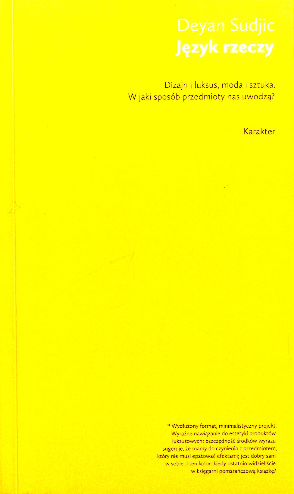 zemu wymarzony komputer pod dwóch latach wydaje się nam bezużytecznym, tandetnym złomem? Z jakiego powodu niektóre przedmioty stają się fetyszami, a inne archetypami? Co dziś jest prawdziwym luksusem: posiadanie pewnych rzeczy czy raczej rezygnacja z nich? Dlaczego dajemy się wciągać w obłędny trans konsumpcji? Na te, a także wiele innych pytań, odpowiada Deyan Sudjic. Odwołując się do konkretnych przykładów z historii i współczesności (komputer Apple, pistolet Walther PPK, krzesło Aeron), pokazuje, że dizajn to swoisty język, który podlega ewolucji i który warto nauczyć się czytać. Dzięki temu będziemy mogli lepiej zrozumieć otaczający nas świat i staniemy się bardziej świadomymi odbiorcami, a może nawet uda nam się uniknąć niektórych pułapek konsumpcjonizmu. Wciągający, błyskotliwy esej, który zmienia spojrzenie na wiele rzeczy.
