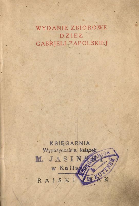 Pieczęcie: Księgarnia Wypożyczalnia książek M. Jasiński w Kaliszu ; Księgozbiór H. Kuttner.