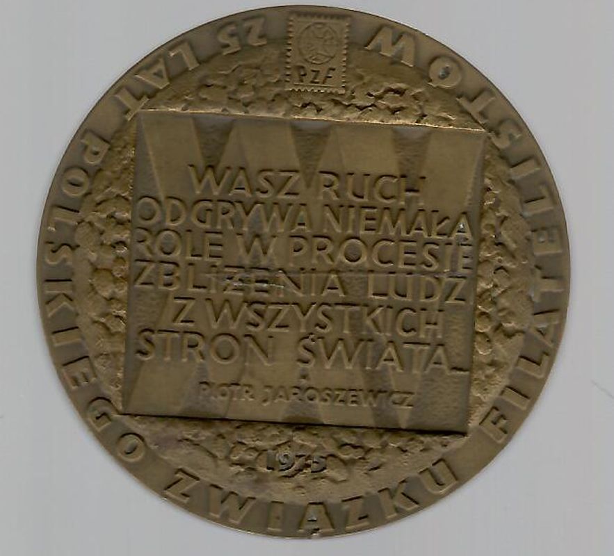 Rewers: Napis w sześciu wierszach: "WASZ RUCH ODGRYWA NIEMAŁĄ ROLĘ W PROCESIE ZBLIŻENIA LUDZI WSZYSTKICH STRON ŚWIATA..." PIOTR JAROSZEWICZ, data 1975. W otoku: "25 LAT POLSKIEGO ZWIĄZKU FILATELISTÓW".