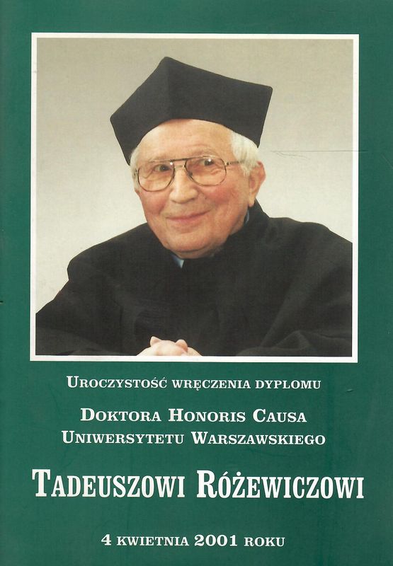 Zawiera: Program uroczystości ; Laudację profesora Drewnowskiego ; Przemówienie Tadeusza Różewicza ; Przemówienie profesora Stanisława Dubisza ; informację o życiu i twórczości Różewicza ; Recenzję dorobku Tadeusza Różewicza autorstwa profesora Ryszarda Nycza i profesora Andrzeja Lama.