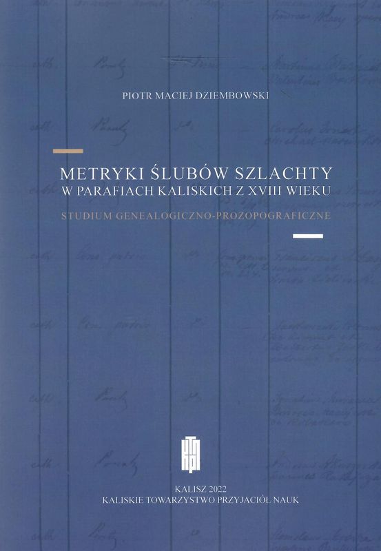 W XVIII wieku na terenie Kalisza funkcjonowały dwie parafie. Były to: parafia Wniebowzięcia Najświętszej Maryi Panny oraz parafia św. Mikołaja. Dzięki zachowanym księgom metrykalnym tych parafii mamy możliwość przejrzenia bogateho materiału genealogicznego sięgajacego do połowy XVII wieku. W opracowaniu ograniczono sie do wypisów dotyczących zachowanych w księgach metrykalnych zawieranych związków małżeńskich osób ze stanu szlacheckiego. Oprócz ksiąg metrykalnych kaliskich opracowanie dotyczy również sąsiadującej z Kaliszem parafii pw. św. Michała Archanioła w Dobrzecu, który obecnie znajduje się w granicach administracyjnych Kalisza. Nie pominieto również utworzonej w 1795 roku, a więc już po II rozbiorze Polski, parafii ewangelickiej, której świątynia mieściła się w pojezuickim kościele pw. św. Wojciecha i św. Stanisława Biskupa. Wszystkie księgi metrykalne wspomnianych parafii przechowywane są w Archiwum Diecezjalnym we Włocławku. [fragment "Wstępu"]
