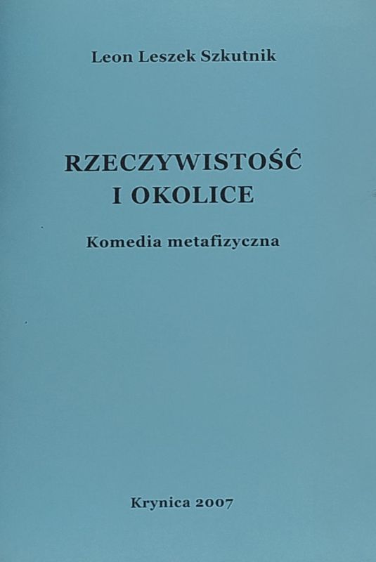 Rzeczywistość i okolice : Komedia metafizyczna / Leon Leszek Szkutnik. - Wydanie pierwsze. - Krynica : [wydawca nieznany], Copyright 2007. - 32 strony ; 21 cm.