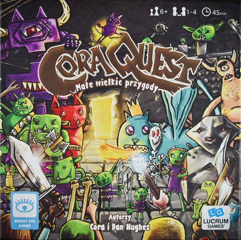 CoraQuest : małe wielkie przygody / Cora i Dan Hughes. - Bielsko-Biała : Lucrum Games ; ©2022. - 1 gra (1 instrukcja, 1 Księga Przygód, 1 poradnik tworzenia przygód, 8 kart bohaterów, 11 kart wrogów, 29 tekturowych figurek, 5 liczników zdrowia, 36 kart lochów, 63 karty skarbów, przedmiotów i ekwipunku, 9 pustych kart, 2 planszetki odliczania, 47 żetonów i znaczników, 7 kości, 4 karty pomocy) : pudełko kartonowe, 23x23x4,5 cm.