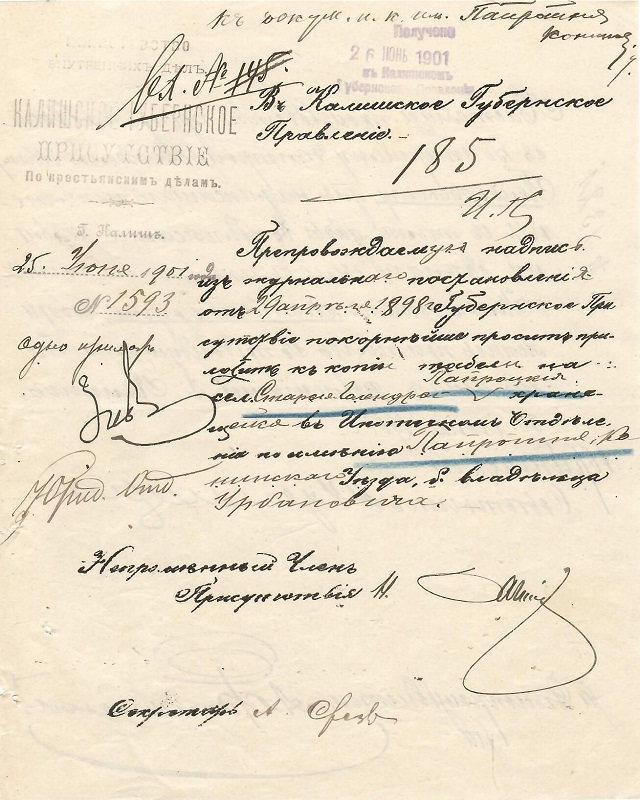 Pismo do Zarządu Guberni Kaliskiej z prośbą o przekazanie kopii dokumentu przechowywanego w Wydziale Hipotecznym. Na odwrocie odpowiedź w w/w sprawie.