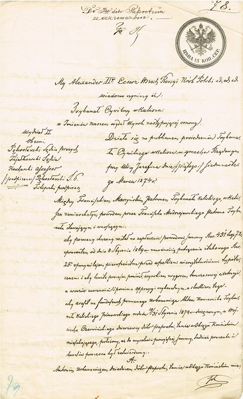 Wyrok Trybunału Cywilnego w Kaliszu w sprawie Franciszka Marzyńskiego przeciwko Franciszkowi Modrzejewskiemu o spłatę wierzytelności - sporządził Filipski; dotyczy dóbr Paprotnia.