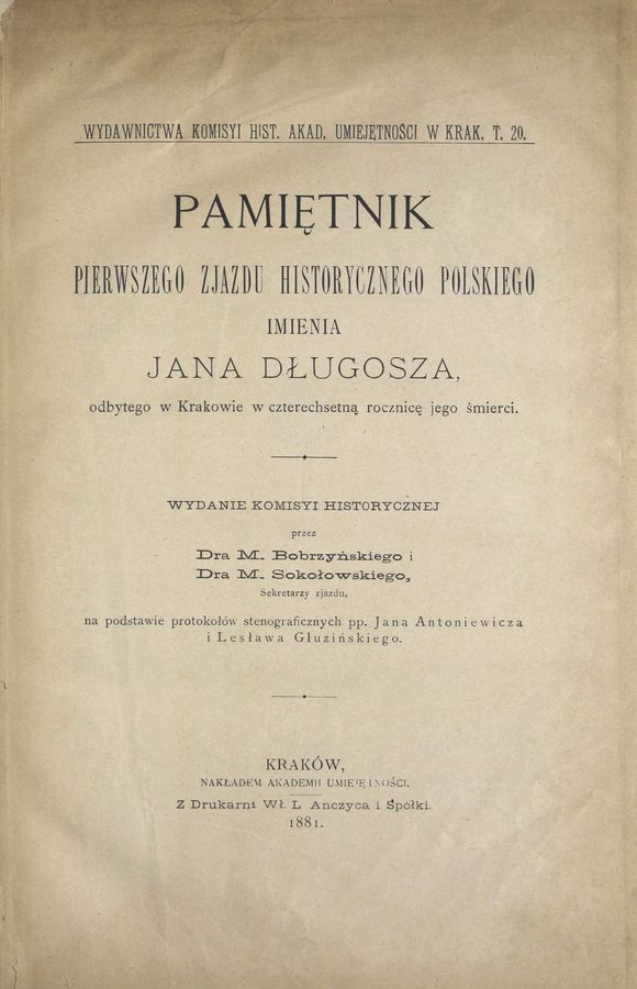 Pamiętnik pierwszego Zjazdu Historycznego Polskiego im. Jana Długosza odbytego w Krakowie w czterechsetną rocznicę jego śmierci - Wyd. Komisyi Historycznej / przez M. Bobrzyńskiego i M. Sokołowskiego. - Kraków : Akad. Umiejętności, 1881 (Kraków : Wł. L. Anczyc). - 154 s. ; 26 cm.