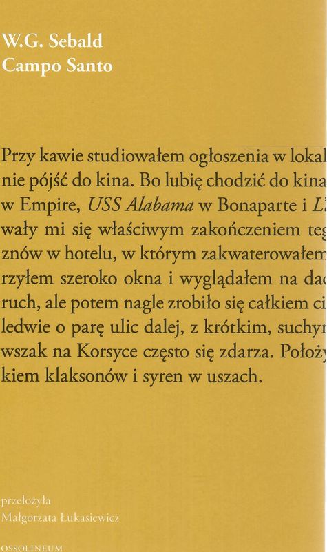 Campo Santo / W. G. Sebald ; przekład Małgorzata Łukasiewicz ; posłowie Renata Lis. - Wydanie pierwsze. - Wrocław : Wydawnictwo Ossolineum, 2023. - 274, [6] stron : fotografie ; 21 cm.