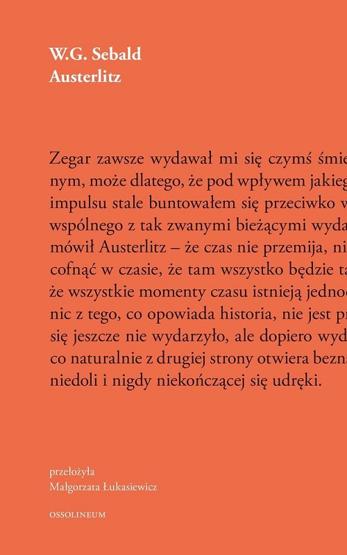 Szkatułkowa opowieść o wyobcowaniu i walce z niepamięcią. U progu drugiej wojny światowej pięcioletni Jacques Austerlitz trafia do Wielkiej Brytanii, gdzie adoptuje go dwoje walijskich protestantów. Wkrótce chłopiec poznaje jednak swoje prawdziwe nazwisko i kraj pochodzenia, a po latach – jako dorosły mężczyzna – rozpoczyna długą wędrówkę, na końcu której spodziewa się znaleźć klucz do zrozumienia własnej tożsamości. [nota wydawcy]