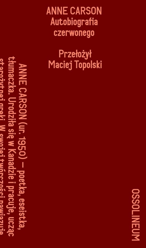 Gerion, wrażliwy skrzydlaty chłopiec o czerwonej skórze, zaczyna tworzyć swoją autobiografię, gdy ma pięć lat. Pewnego dnia, już jako zagubiony młodzieniec, natrafia na butnego włóczęgę Heraklesa. Ich spotkanie jest jak wybuch wulkanu. (...) Autobiografia czerwonego jest powieścią-poematem, rozszczelniającą ramy gatunkowe i wyrastającą z praktyki przekładu literackiego, napisaną po Homerze i Stezychorze, po Emily Dickinson i Gertrude Stein – dowcipną, inteligentną, niepowtarzalną. [empik.com]